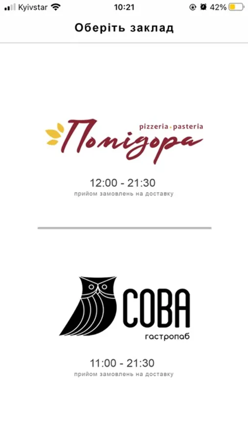 Два ваших улюблених заклади в одному додатку: піцерія-пастерія "Помідора" та паб "Сова".