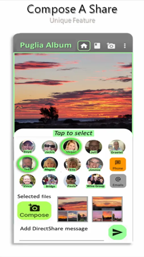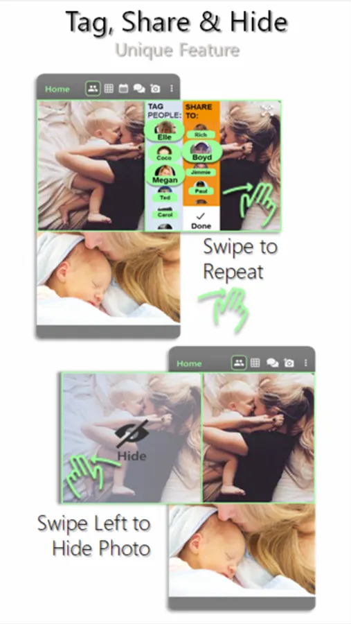My Family & Friends does the work of automatically organizing your memories in SmartAlbums or Folders. Handling new photos or videos is both quick and easy. Simply Swipe left and Tap to Hide unwanted photos, or Swipe right and Tap to AutoFile or Share your memories with family or friends. Organizing your memories has never been easier.