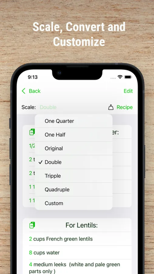 CONVERT AND SCALE your recipes by any amount in case you want to make a smaller batch or in case you have company coming over. Ingredients can be separated into different groups so recipes with different sections stay separate for clarity.