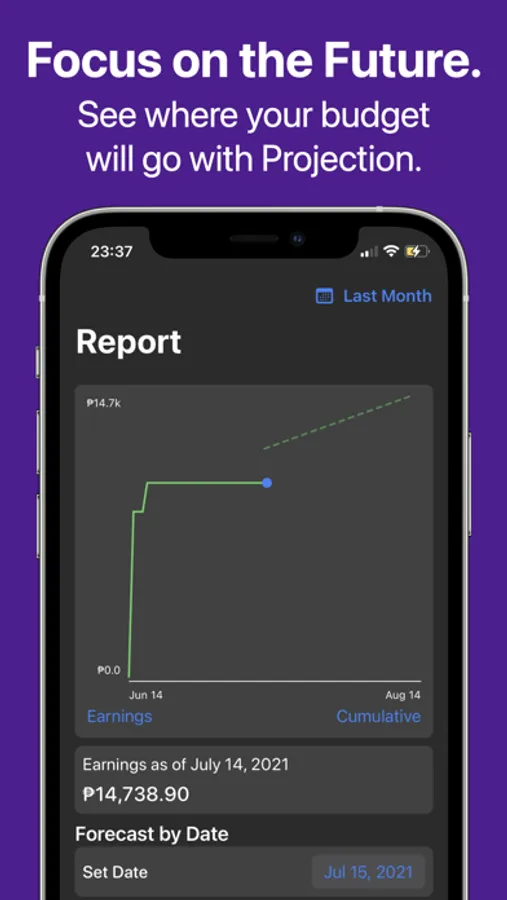 Report also forecasts where your earnings or expenses might end up, all from your data. See a graph which shows where your personal budget might end up at by the end of the week, or the end of the month. Customize your projections by choosing a custom date on which you want your forecast to show, or input a custom amount of earnings, expenses, or net money to see when Magnate thinks you'll be able to achieve them.
