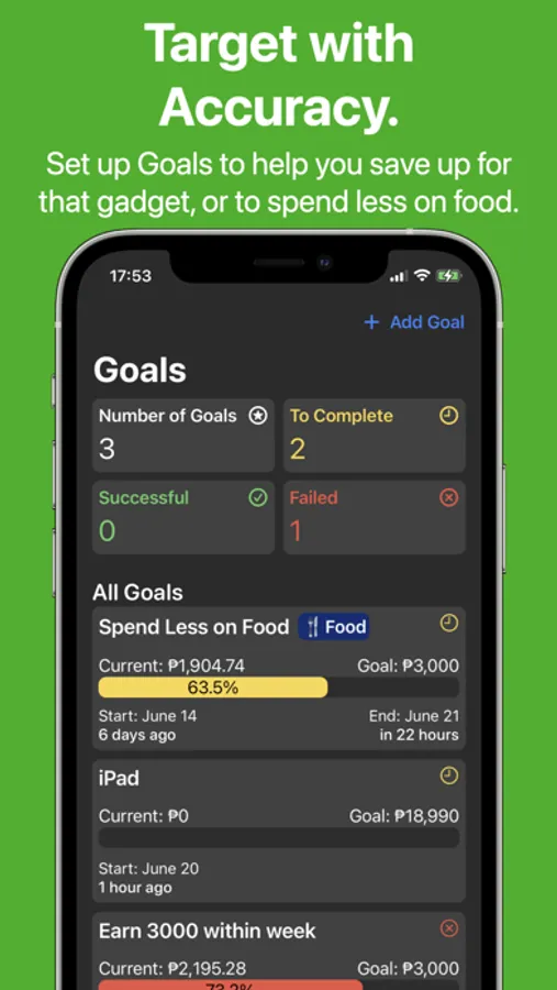 Set a budget target with Goals! Hit a target amount of earnings or net money to let you save up for that dream gadget of yours, or limit your expenses within a time period to let you reduce the amount of money you're spending on food -- Magnate gives you the power. If you didn't set a date for when you want to hit your goal, Magnate does the math to let you see when it thinks you'll be able to achieve your goal, letting you adjust your habits accordingly.