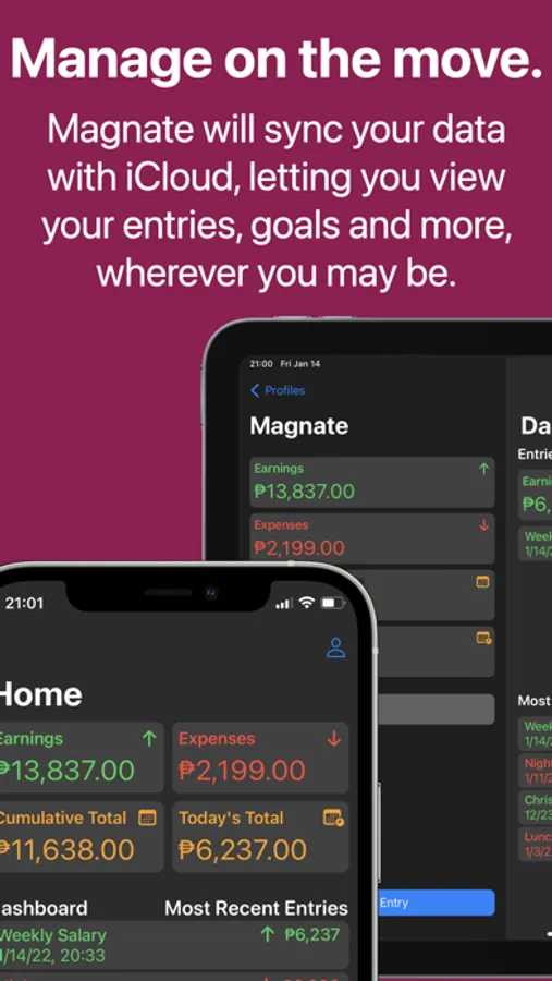 Magnate will sync your data with iCloud, letting you access your entire budget easily wherever you may be. Log those coffees you bought in the store with your iPhone, then view how that affected your charts in Report on your iPad -- Magnate does the data magic for you.
