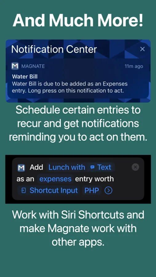 Magnate has support for Siri Shortcuts, letting you interact with all the other apps on your phone in the shortcuts and automations your imagination can come up with! Want to add an entry once you sent money to your friend on Apple Pay? You can now do it automatically!