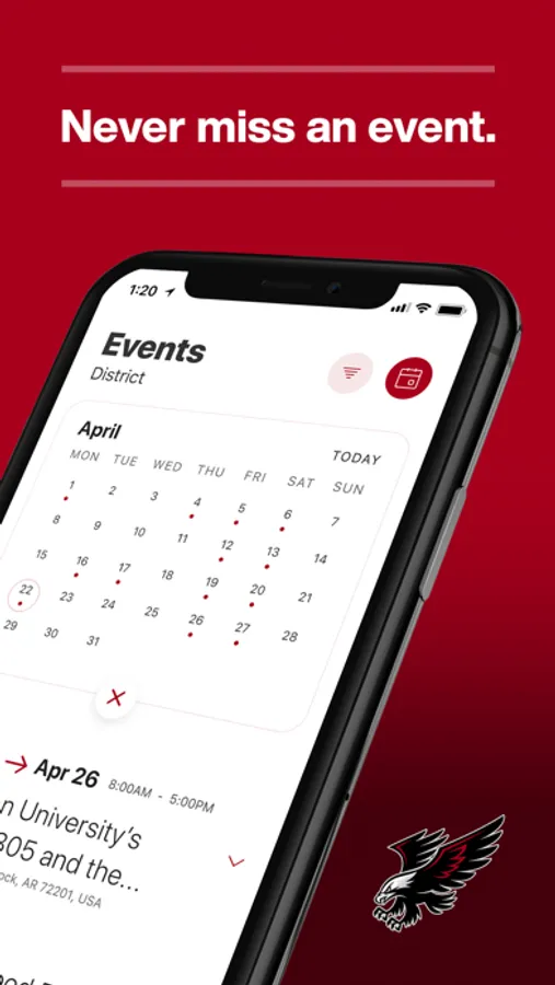 The event section shows a list of events throughout the district. Users can add an event to your calendar to share the event with friends and family with one tap.