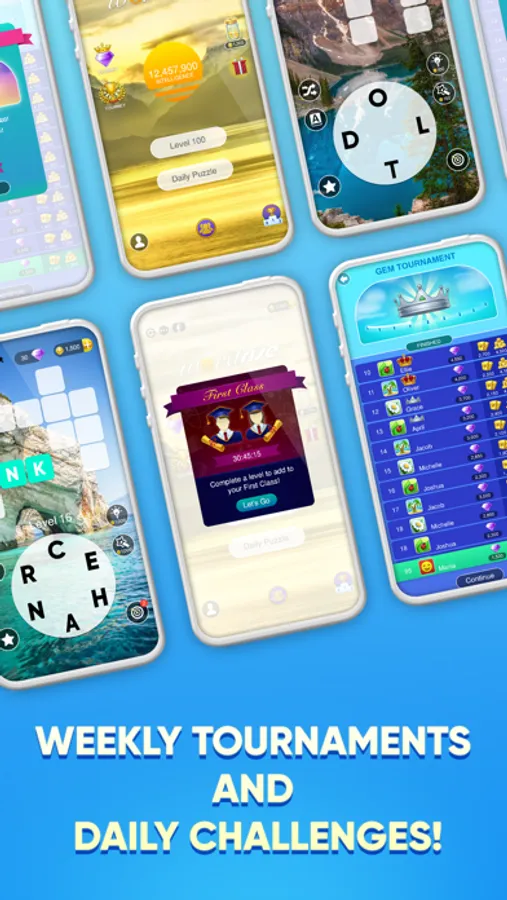You can also receive recognition for completing a set of levels. You will progress by graduating from one tier to the next. Each time you graduate, you're entering a smaller number of elite word game solvers. Play more to unlock Tournament features, where you can compete with others to rank the highest in your region, and the world!