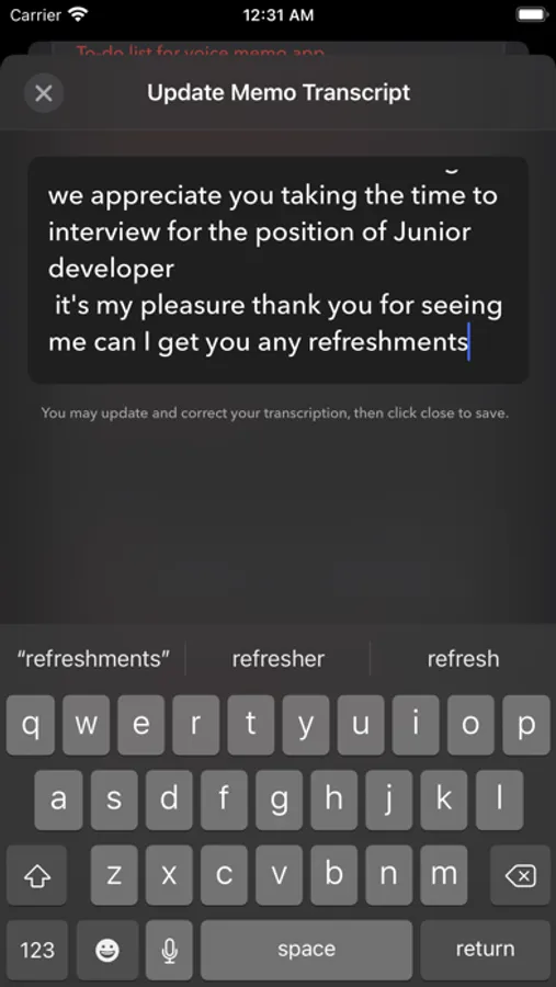 Share your voice memo audio file or text transcription at the click of a button. We also have fully editable transcriptions, so you can correct or add notes to your memos at any time.