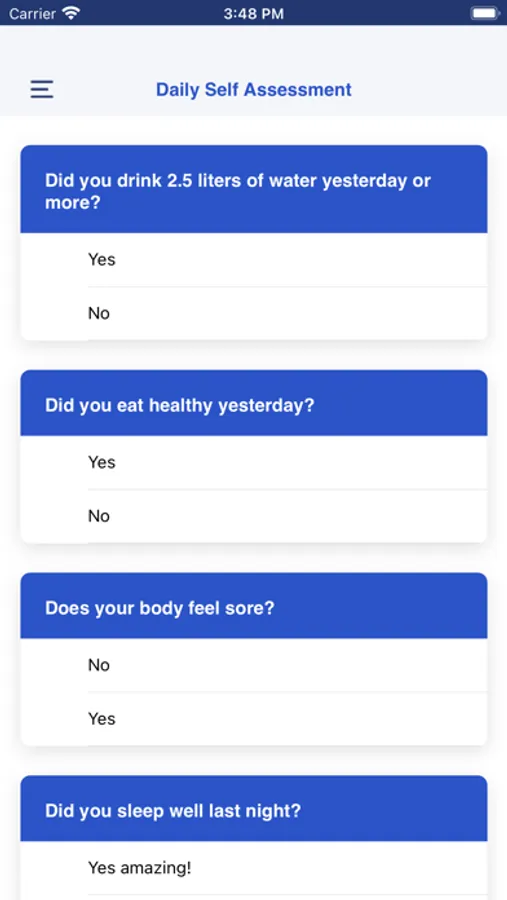 - Daily questionnaire tracks lifestyle metrics of hydration, sleep, nutrition and recovery
