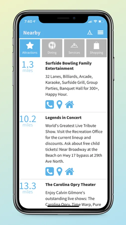 Find Emergency info under “Services” (such as vets, doctor, vehicle repair). Locate nearby Attractions, Dining, Services and Shopping! Click “Outdoors” to learn more about Biking, Fishing, Water and more.
