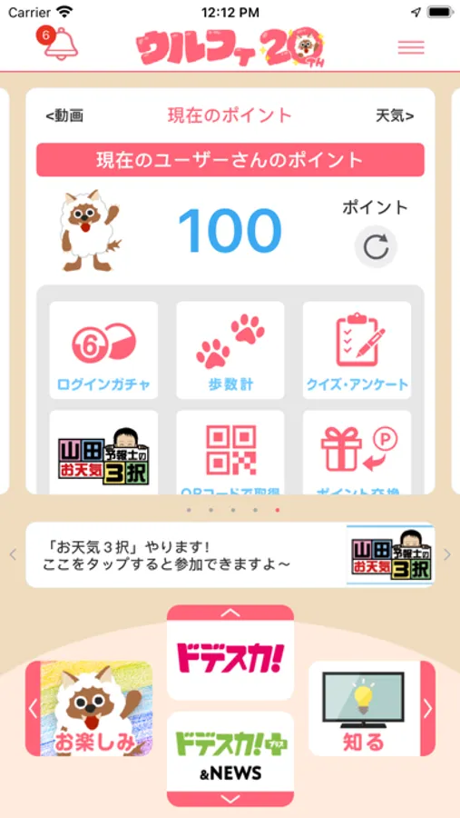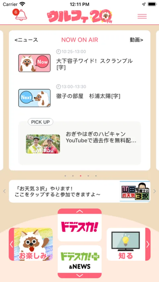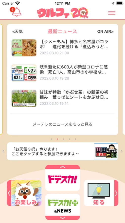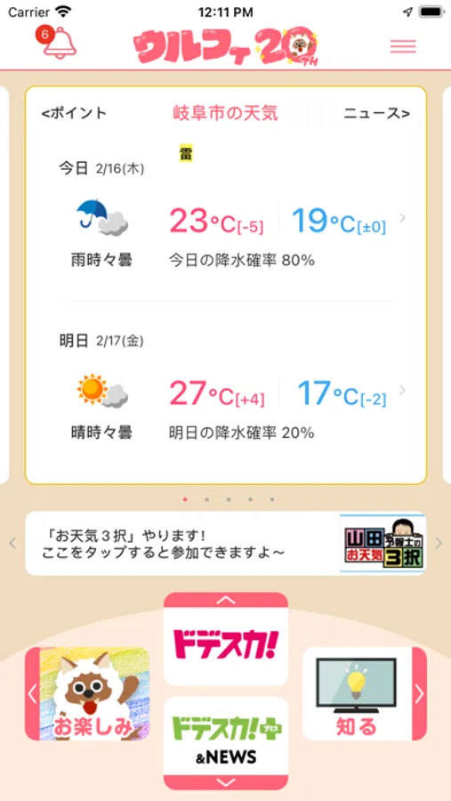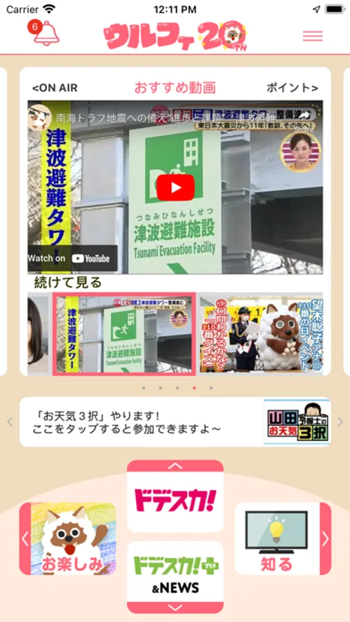 夕方の情報番組「アップ!」の番組中に放送される大人気コーナー「お天気3択」にアプリから参加できます。