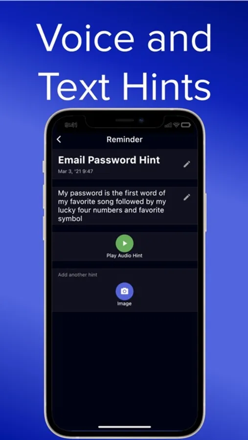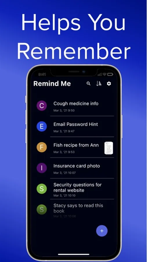 Remind Me helps you remember anything on the go with audio, text, and photo reminders. Add reminders for password hints, security question hints, medicines and brands you like, recipes to try, and anything else you want to be sure not to forget.