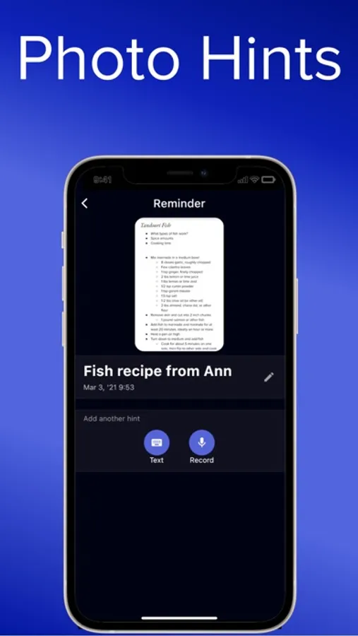 Easily and quickly add a note, a photo, or an audio recording along with a reminder name. Whenever you need to, you’ll be able to come back to Remind Me to find the info you need.