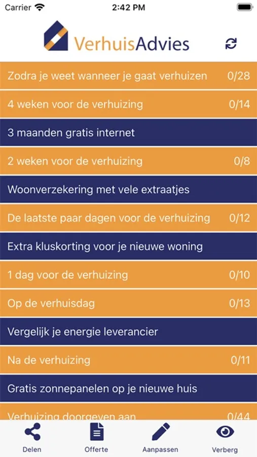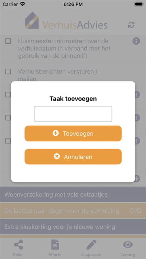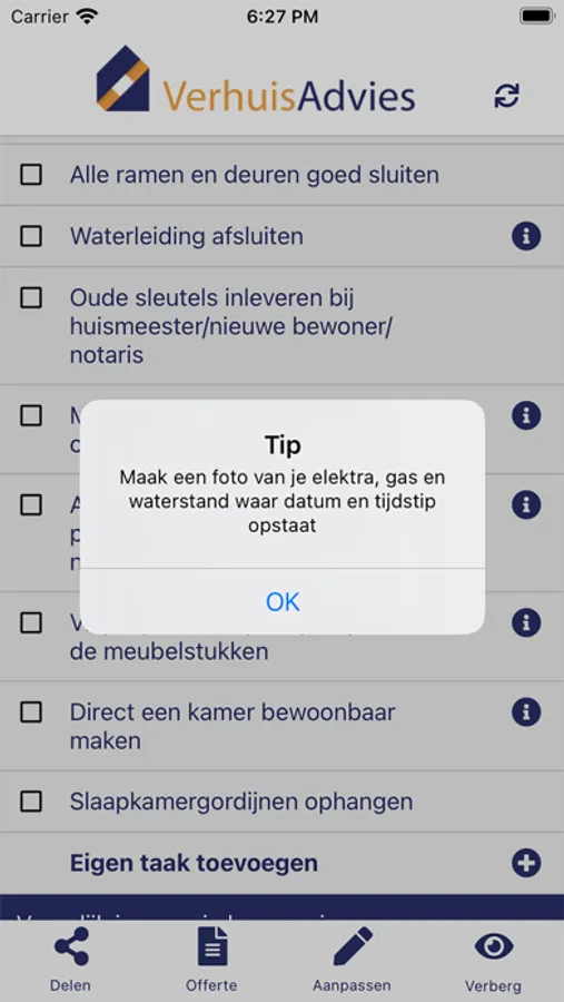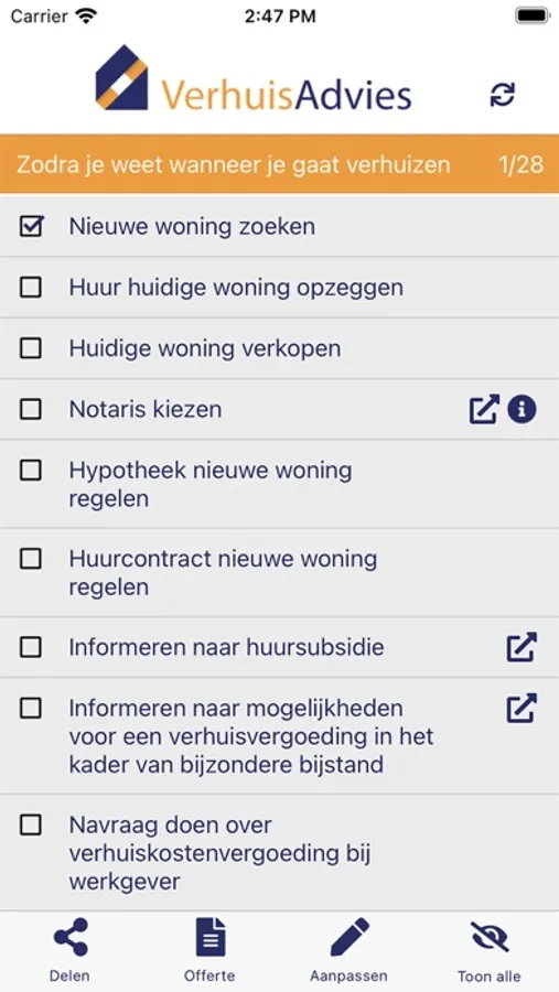 Tijdens alle fases van je verhuizing weet je precies wat je moet doen en kun je zelf ook taken toevoegen, naast de handige taken en aandachtspunten die de app al voor je aangemaakt heeft, waaronder: