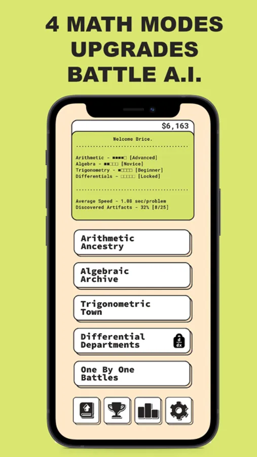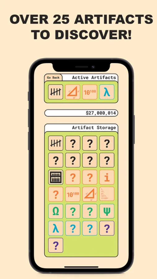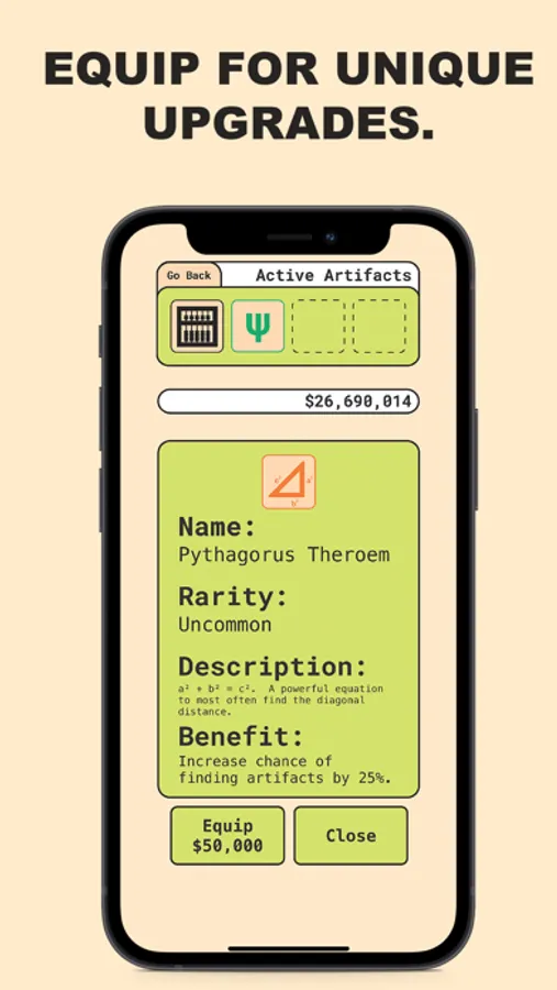 UPGRADES: You have a chance of encountering a "Golden Problem", solve correctly and you'll receive a math artifact that can be equipped to enhance your experience. There are 25 artifacts with 9 unique upgrades that can be used to strategize your problem-solving career!