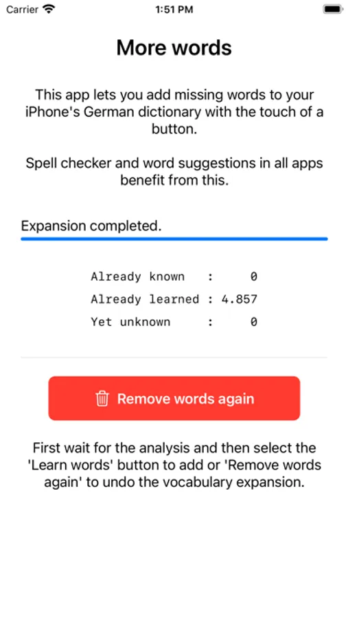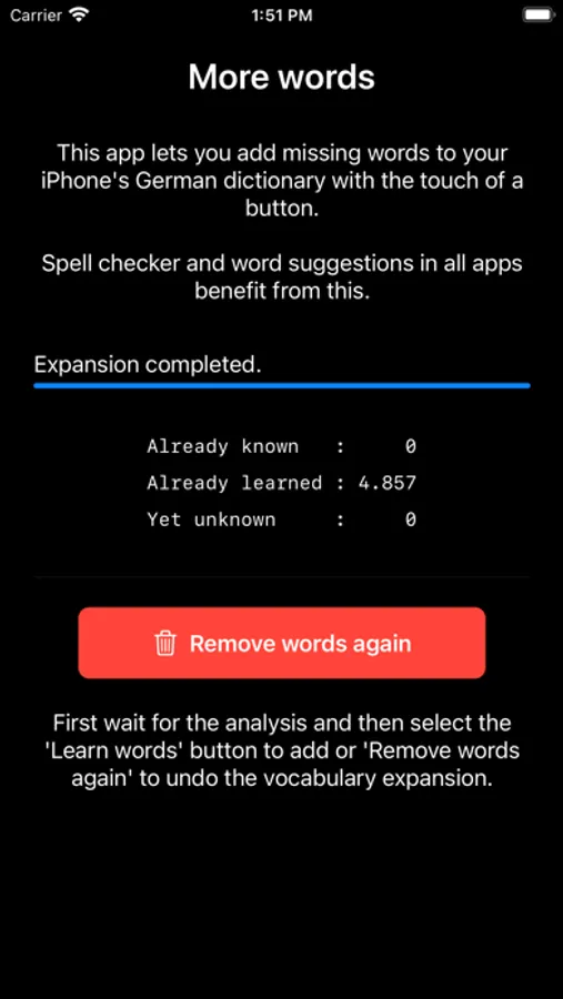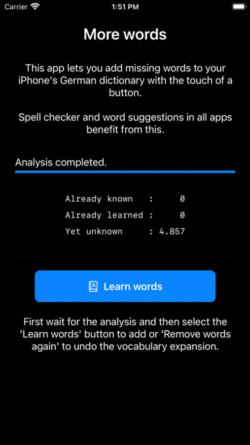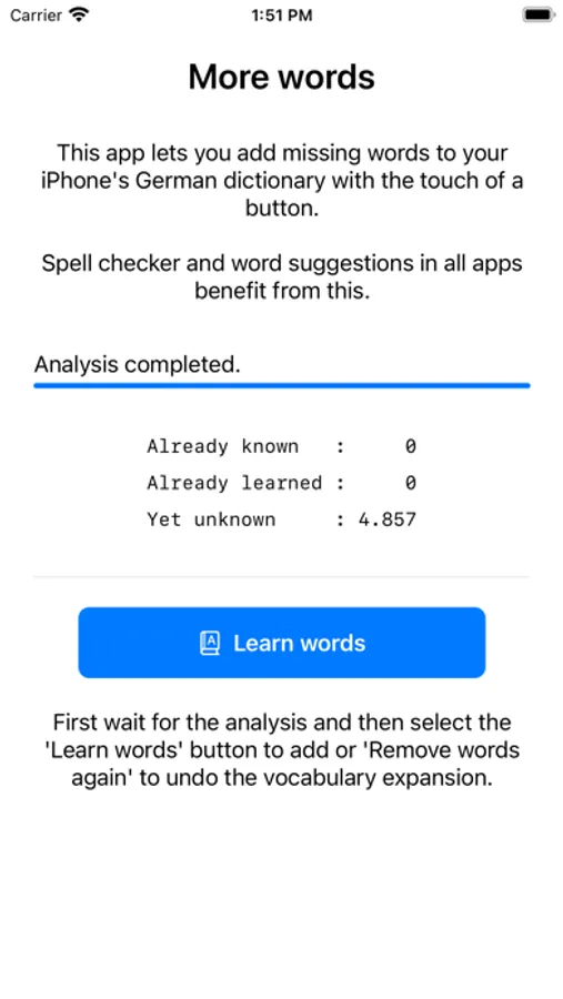 Word examples that an iPhone can't understand without the app: Abscheidung, Beautycase, Checker, Diskontinuität, Einbehaltung, Fantastik, Gimmick, Hehlerware, Inklusion, Jagertee, Kakofonie, La-Ola-Welle, Mautgebühr, Nordpolarmeer, Ohrstecker, Parteiensystem, Quilt, Reifungsprozess, Sanktionierung, Tiramisu, Unangepasstheit, Vorkasse, Wegfahrsperre, Xylografie, Yps, Zuarbeit and thousands of words more.