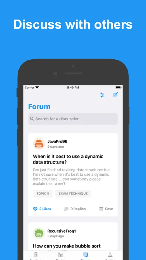 - Forum where you can discuss difficult topics and ask question relating to the course