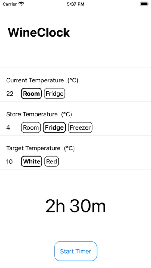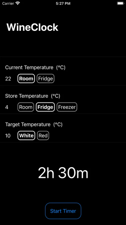 To get the time you set the current temperature of the wine, the temperature you want it to have when you drink it, and the temperature in the place where you will store it - e.g. the fridge. You can either set the temperatures yourself or use some common temperatures with quick-select buttons. When the temperatures have been set a time is calculated, and you have the option of starting the timer.