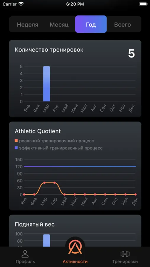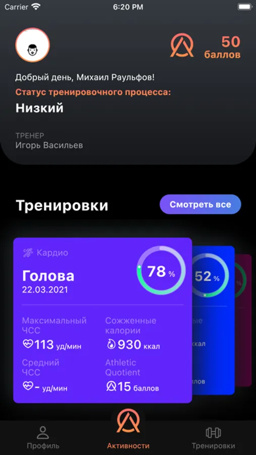 - определение эффективности тренировочного процесса при помощи AQ баллов, которые набираются во время занятий с персональным тренером.