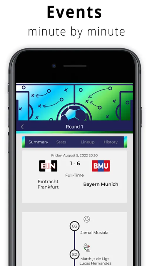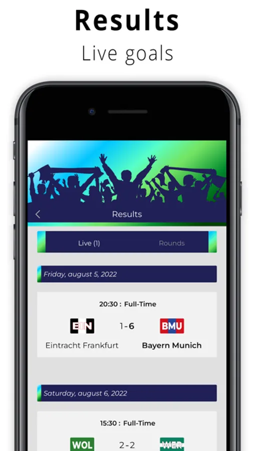 - Follow the matches in LIVE mode. All the events of the match: result, goals, cards, etc.
