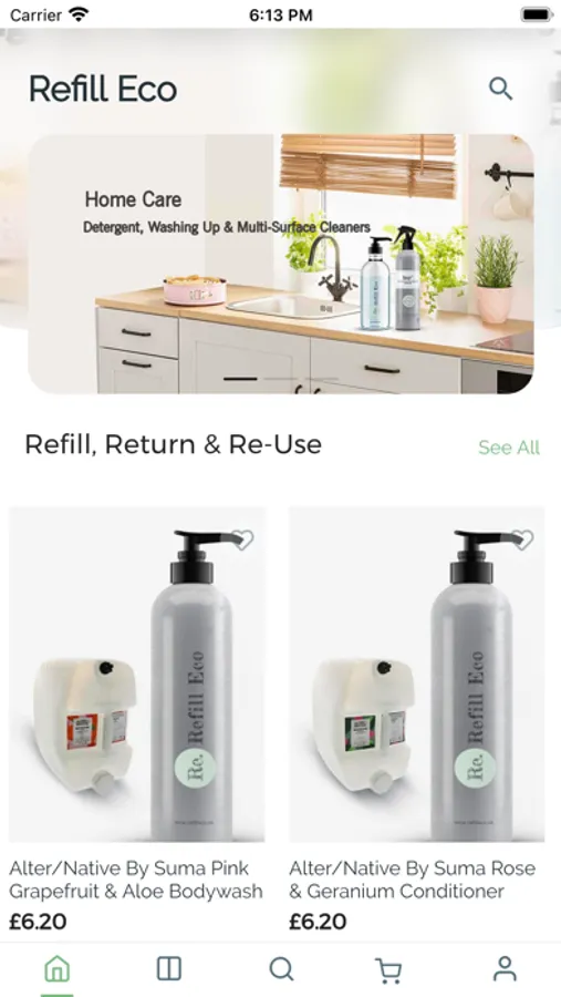 Stocks Home and Personal Care Products in Refill and Reuse Bottles.