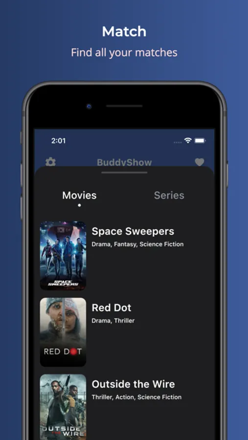 Swipe right or left each movie or series you want to see or not. If your buddy also liked the movie/series you will be able to find it in the list of matches.