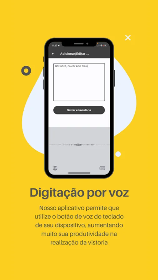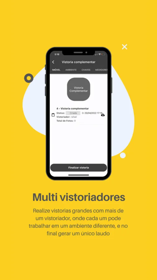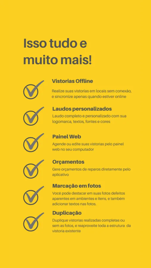 Aplicativo de vistorias de imóvel, elaborado pensando na performance da execução da vistoria, diminuindo o tempo gasto no seu dia a dia. Permite realizar uma vistoria completa e bem detalhada, que por fim pode ser transformada em um laudo assinado digitalmente, que pode ser enviado diretamente aos intervenientes. Ganhe mais clientes através de vistorias mais completas e detalhadas, com menor esforço.