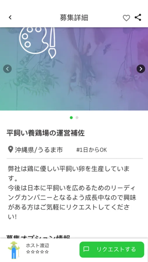 「ホスト」は事業の手伝いや自分の仕事などを「ヘルパー」に手伝ってもらうお返しとして「食事、宿泊施設」などを提供し募集を行います。またその土地に行きたい「ヘルパー」を探すこともできます。