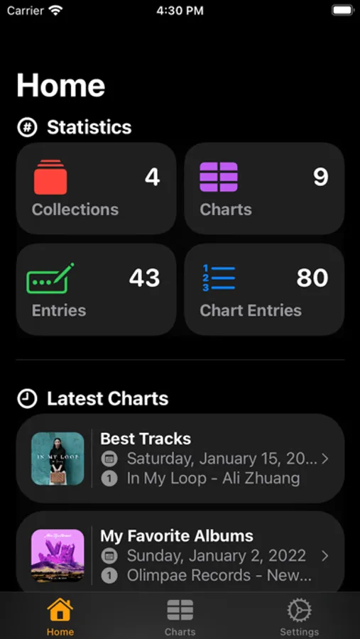 This app is for music lovers that need more than the seasonal 'what did I listen to' lists of Apple Music and Spotify. Be in control of your own charts, not solely determined by (accidental) listening behaviour but carefully curated by you.