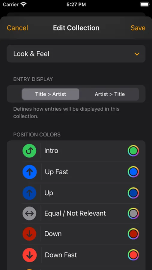 - define characteristics of a collection, like number of entries, colour scheme for entries moving up, down, …