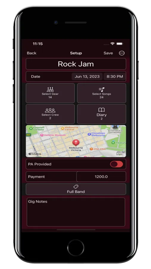 And when you are ready to Gig, pull it all together into the Gig….. date, time, Running Order, ToDo's, payment, notes, duration, Song Setlist, Contacts, Gear Checklist, and Venue details. Checked in/out status of Gear is saved. All libraries and Gig details are synced across iCloud.