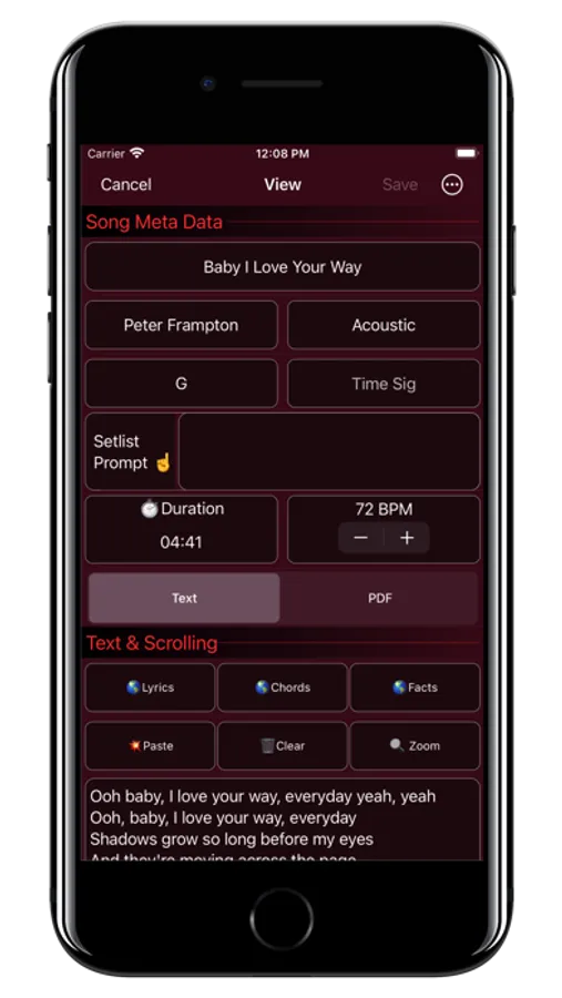 • Keep all of your songs in one place, with a Setlist creator, Gig duration wizard, autoscrolling display of your lyrics or chords (with a visual metronome), or scan your song sheets or chord charts right into the GigBag Song Library.
