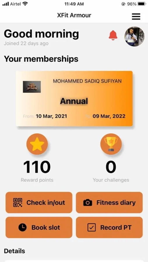 XFit Armour app automatically syncs with your studio to give you information about your fitness journey.