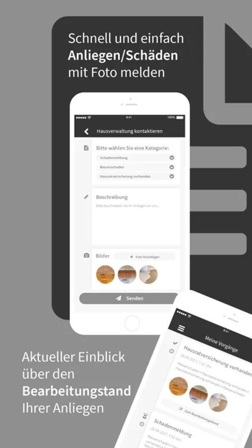 Als Mieter oder Eigentümer können Sie Schäden oder Anliegen direkt mit Fotos über unsere App melden. Ihre Anfragen stehen unseren Mitarbeiten dann zur Verfügung und können auch an Handwerksbetriebe weitergeleitet werden.
