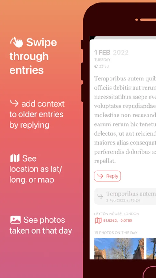 - Entries are saved with time, location, and weather. Entries are displayed with photos taken on the same day from your device photo album.