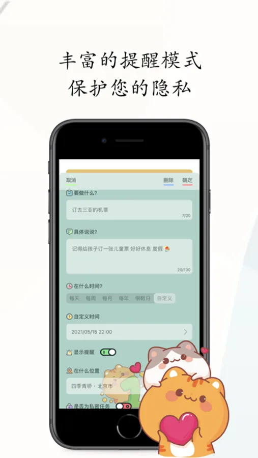 您可以通过猫咪锁屏创建您的任务、提醒和倒数日来管理您的日常,我们提供了丰富的任务定制内容,满足您的日常需求。