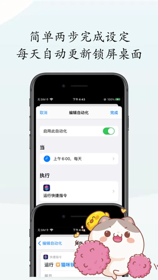猫咪锁屏提醒可以每天自动将您的提醒和待办展示在您的锁屏壁纸上面。
