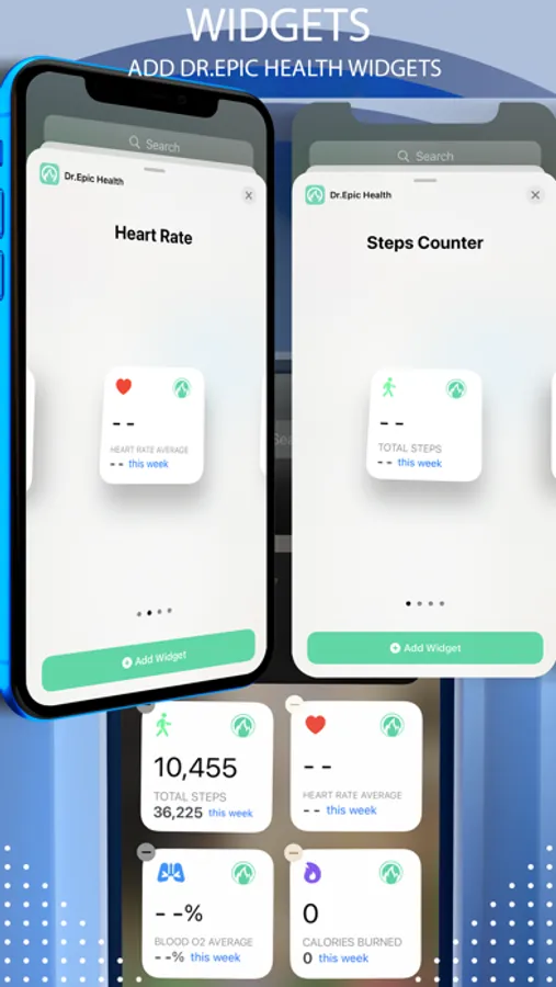 * WIDGET * – Add "Dr.Epic Health Widget" to your iPhone in order to view your Total Steps, Calories Burned, Blood O2, and Heart Rate, as seen and illustrated above (the App’s screenshots)