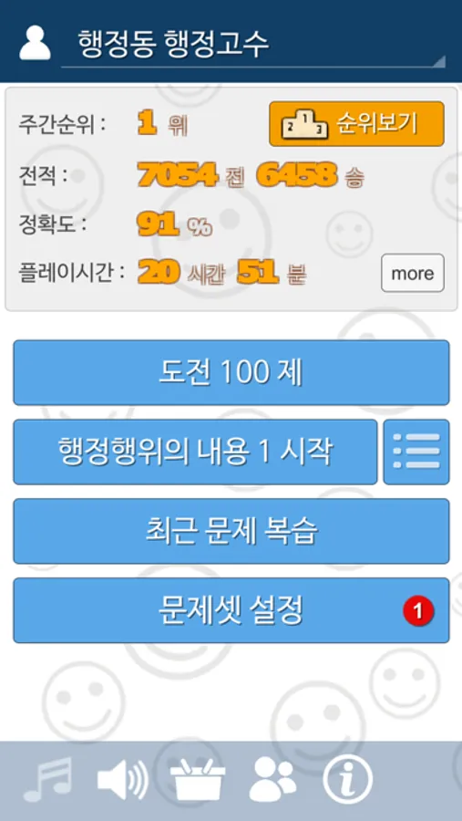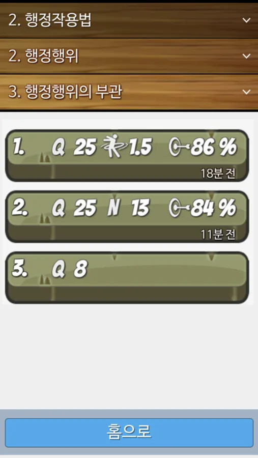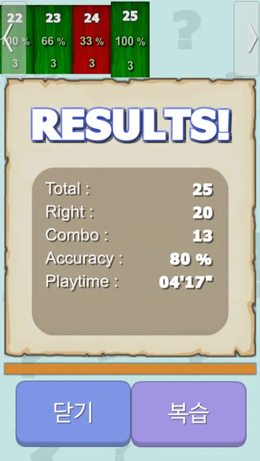 '도전 100제', '진도별학습' 에서 풀었던 문제를 최근 문제부터 보여줍니다.