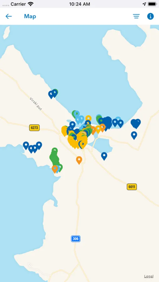 At the interactive chart, taking into consideration the current position of the user, positions are sorted by categories: Accommodation, Beaches, Cultural heritage, Public services, Tourist info and Gastronomy, with the possibility of navigation to the selected object.