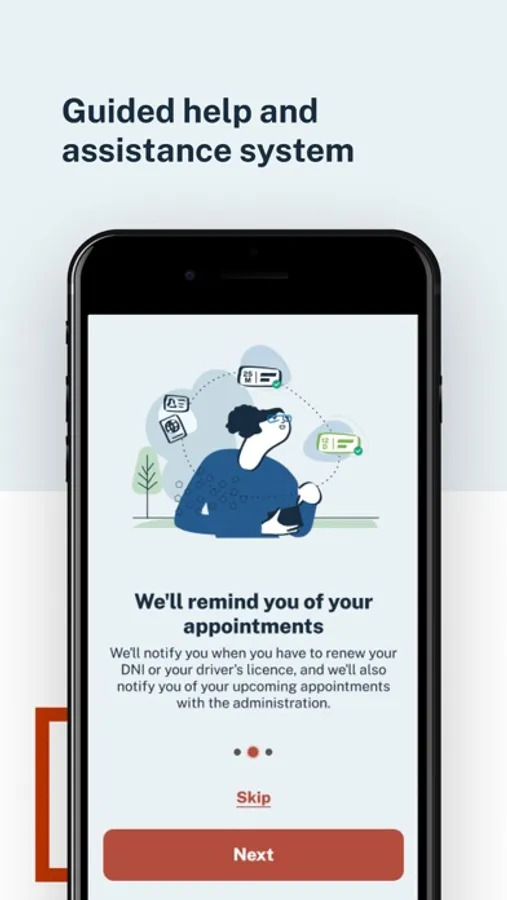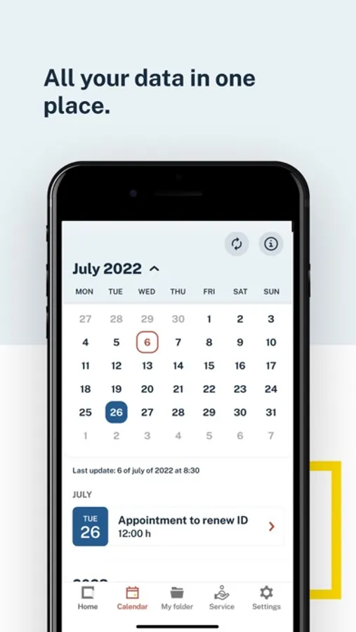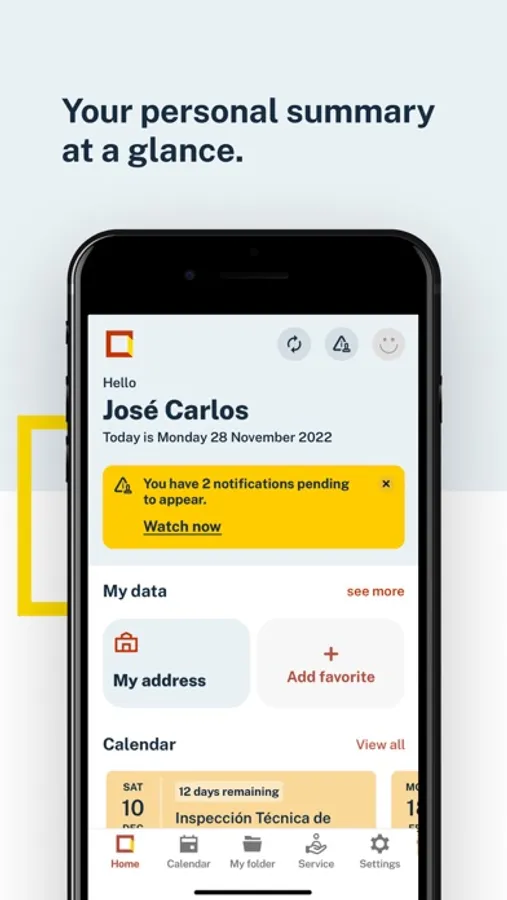 Calendar, to display your alerts regarding pending procedures with the Administration (DNI expirations, their electronic certificates, Passport, Driving License, ITVs) and your previous appointments with different administrations such as for the issuance of documentation by the Dirección General de la Policía (DNI, Passport, TIE), immigration appointments, a large number of registration assistance offices of various ministries, all government delegations and sub-delegations, civil registries and judicial offices, and other agencies that will be gradually incorporating.