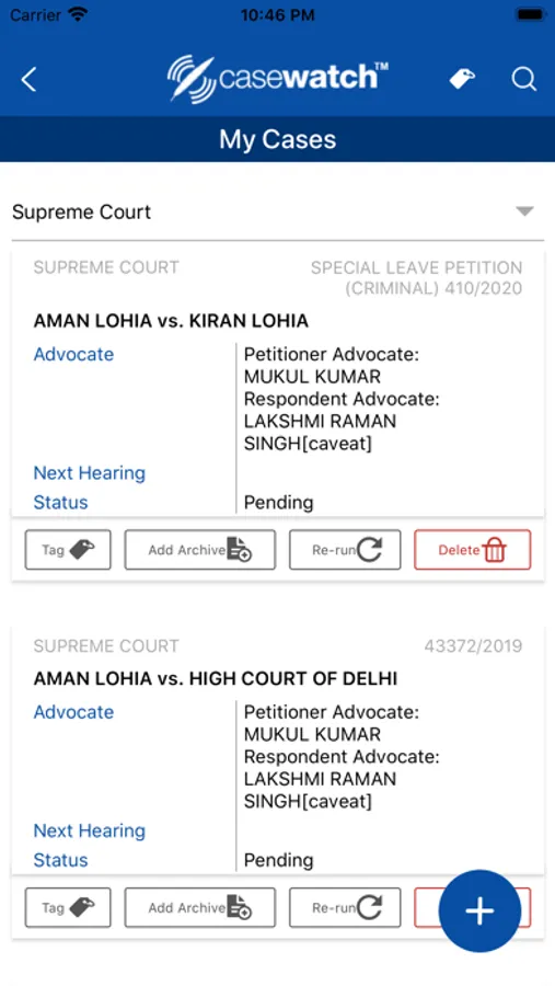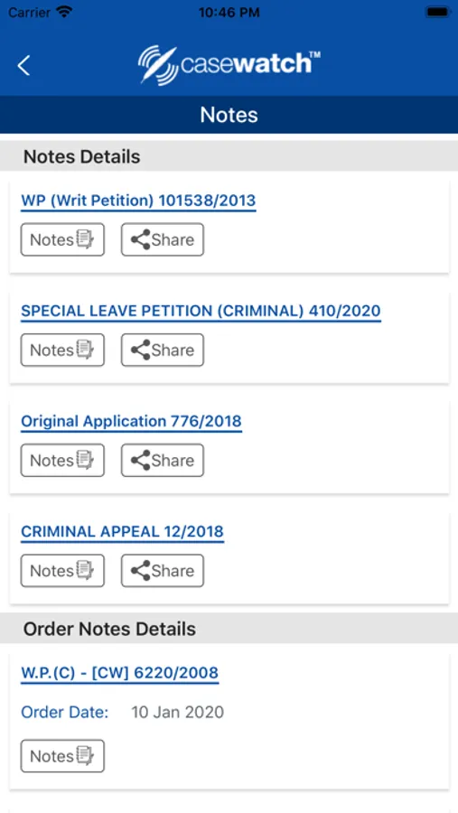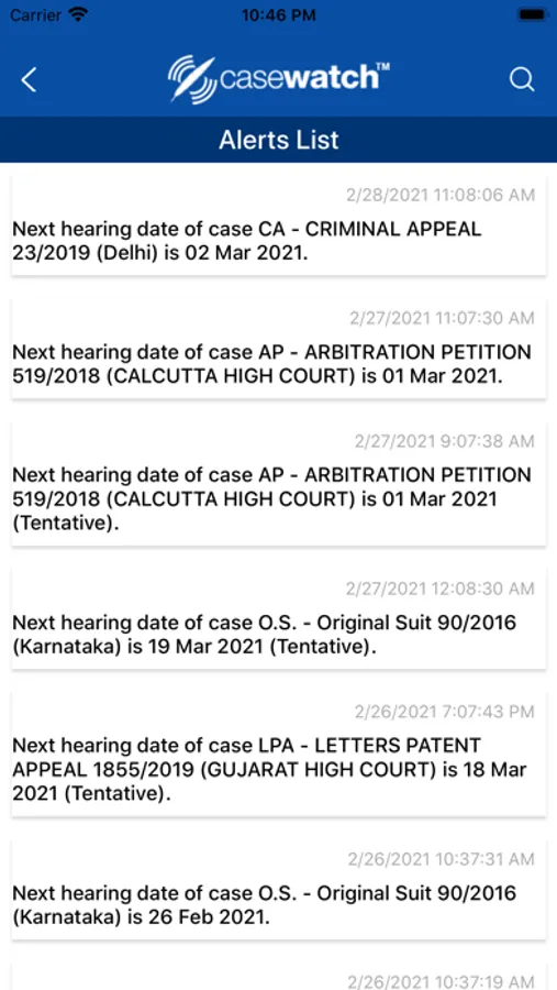 CaseWatch allows user to add their running cases, and get alerts regarding the orders and next hearing date etc.