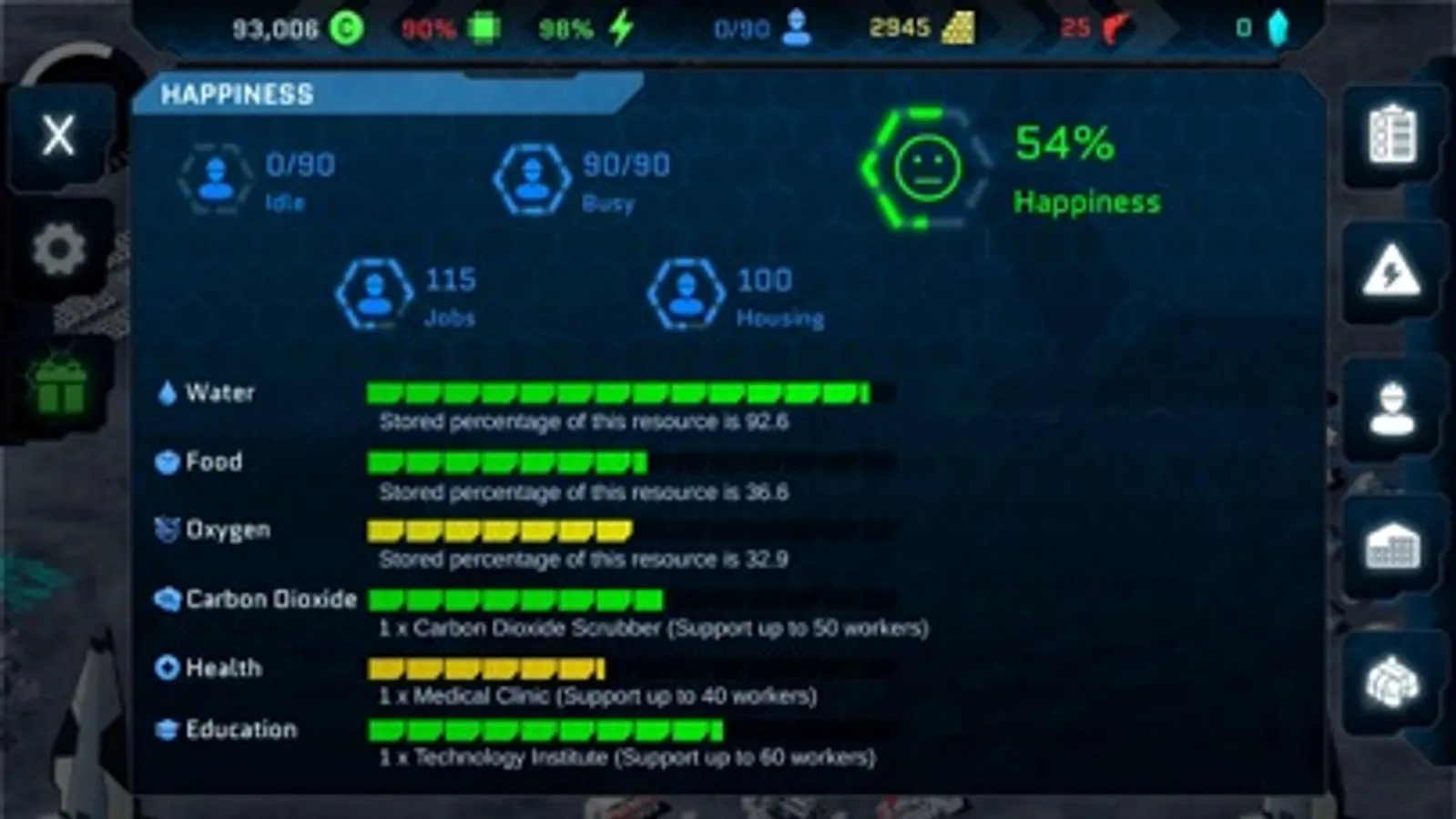 Pantenite Space Colony is constantly growing. Construct infrastructure such as sollar arrays, power plants, batteries, arc reactors, medical clinics, carbon dioxide scrubbers, technology institutions, greenhouses, water extractors, oxygen generators, hydrogen storage facilities, fuel refineries, and so on. Provide your colonists with water, food and oxygen.