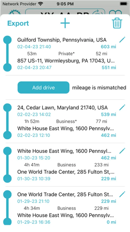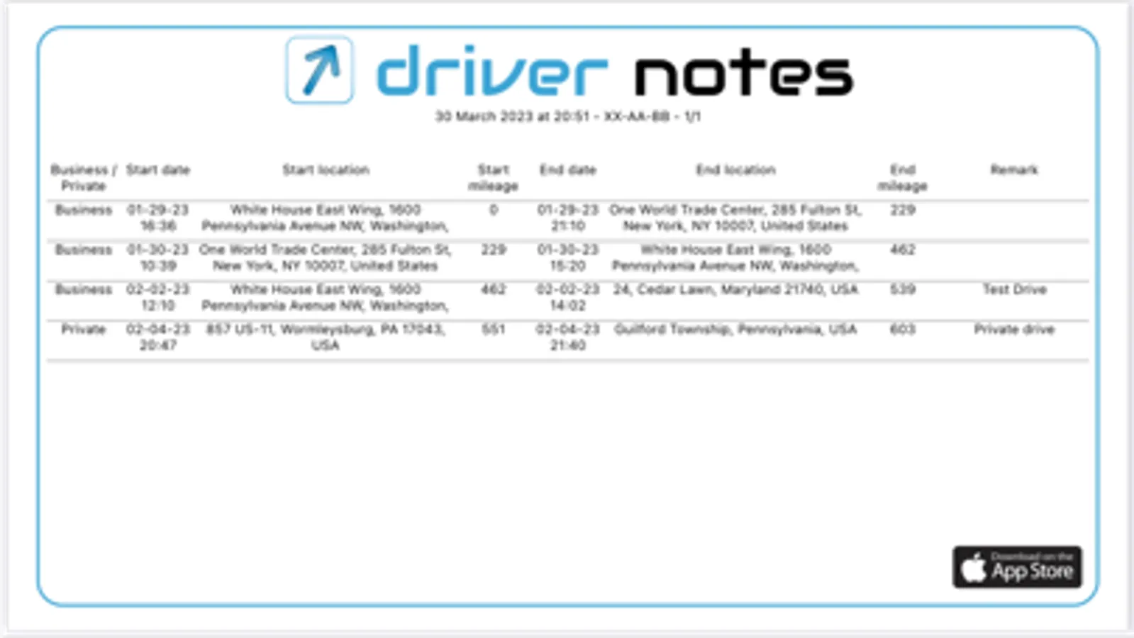 Driver Notes is specially developed to keep your trip registration as simple as possible. Press "Start Drive" when you drive away and "Stop" when you arrive at your destination. Enter your current mileage and .... done! No commercials! Easily view, edit or share your history.