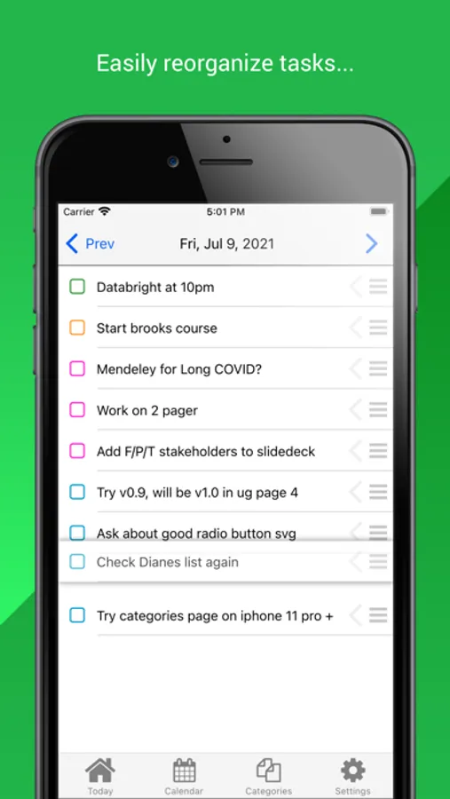 Organize lets you organize activities by day/date, group related items together and add, edit and prioritize items quickly. Of course you can give them that final check when completed! An integrated calendar shows which days have tasks and lets you easily navigate to any day. Includes a 4-page visual user guide and online video demo.