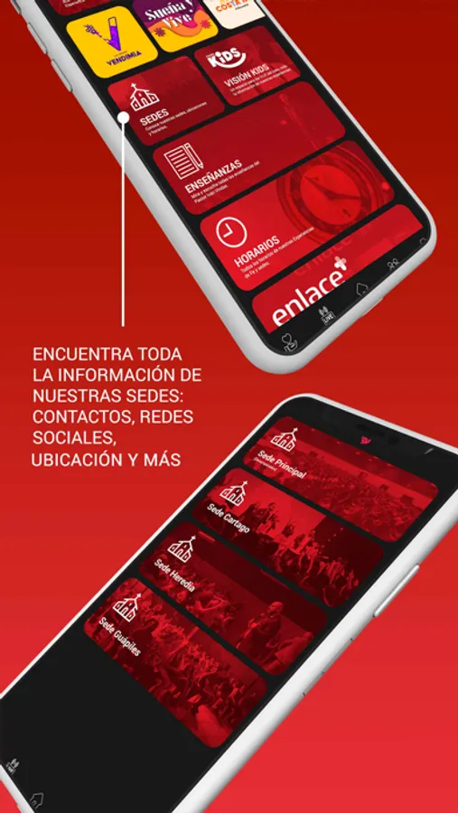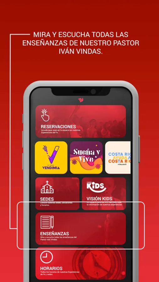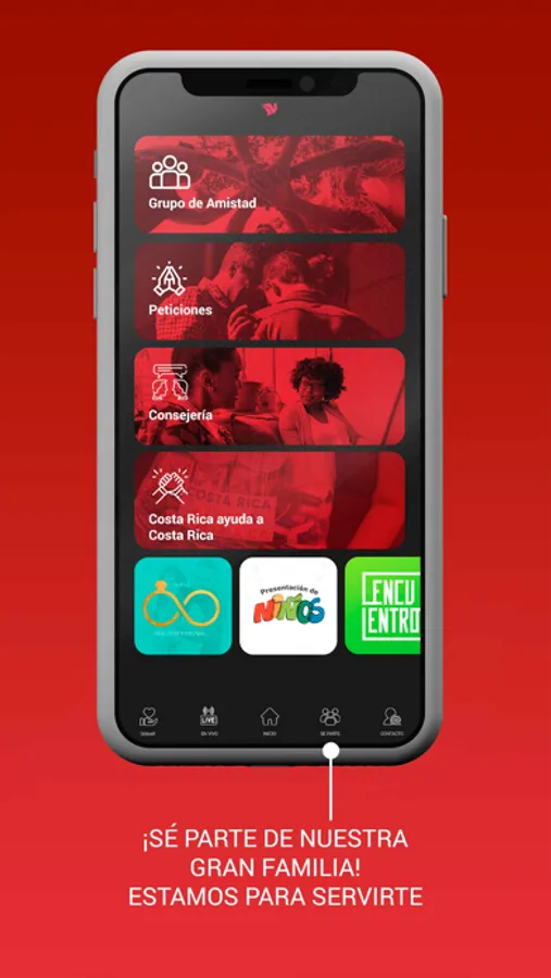 Podrás ver las Experiencias de Fe en vivo, tener información de nuestras sedes, eventos, redes, grupos de amistad, enviar tus peticiones de oración y más.