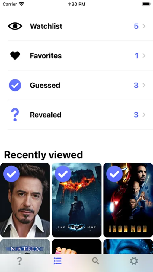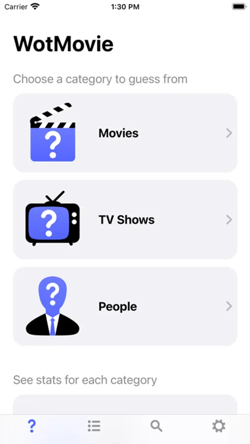 Stats show how many Movies, TV Shows, and People you've guessed correctly, as well as how many you've revealed.