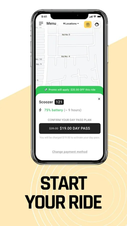 Once your ride starts, your app becomes your key! With it, you can start the scooter, turn it off when it’s not in use, such as while you’re in a store, and finish your rental.