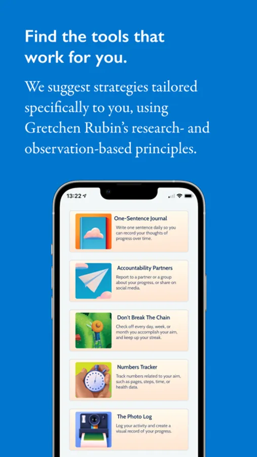 Join the millions of people who have taken Gretchen Rubin’s Four Tendencies quiz to find out whether you’re an Obliger, Questioner, Upholder, or Rebel. This groundbreaking personality framework helps the app recommend the most effective tools for you.