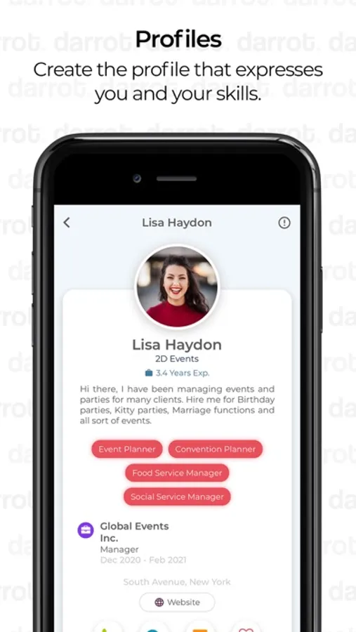 - Showcase your work photos, education experience, work experience, websites and other details to attract people looking to hire.