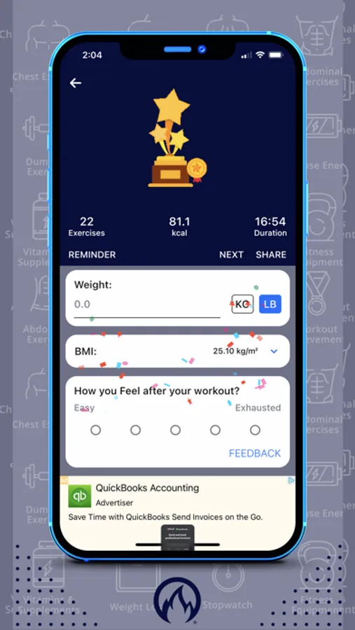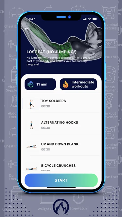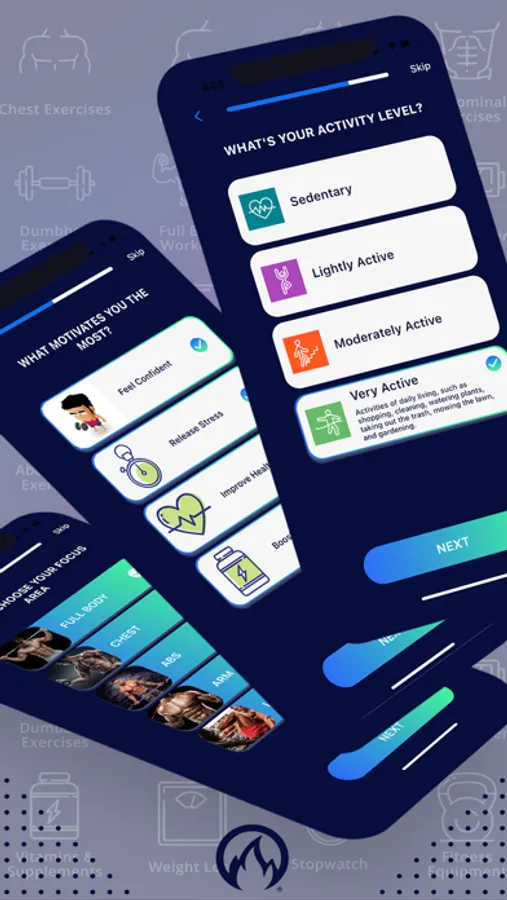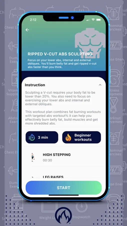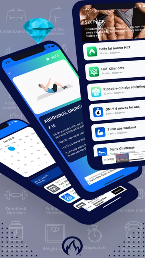 Build Muscle Mass, 6 Abs in 30 Days, Strengthen your Core, Setup Reminder, Set Daily Goal to burn Calories, Workout Challenges
