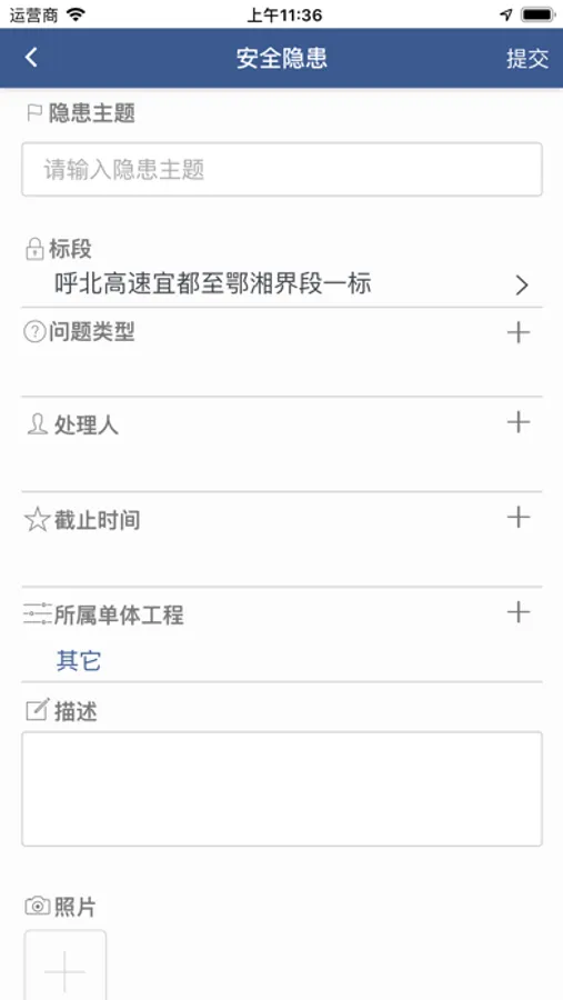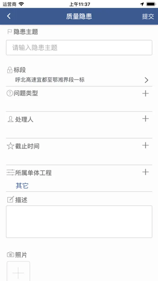本应用主要服务于呼北高速宜都至鄂湘界,具备日常考勤/请假等基础功能以及施工检测中的工序/隐蔽工程/质量/安全隐患等上报和审批处理。